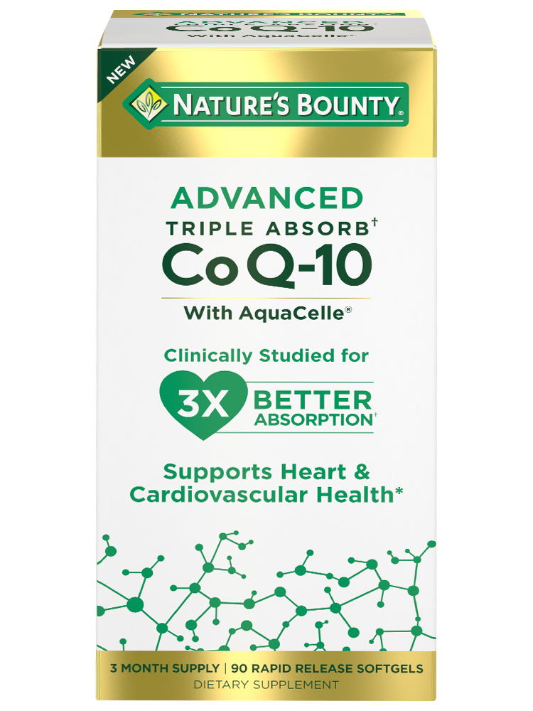 Support your cardiovascular and heart health with Nature’s Bounty Advanced Triple Absorb† Co Q-10 with AquaCelle.* Containing 100mg of Co Q-10 per serving, our innovative formula delivers enhanced absorption† to support overall heart health and cardiovascular health, contributes to healthy aging, and supports cellular energy production.* To ensure your body’s cells are getting the most from your daily supplement for heart health, our formula features AquaCelle, a breakthrough technology that helps to optimize the absorption of Co Q-10 and has been clinically studied for 3x better absorption.† Co Q-10 is an antioxidant that is essential for powering the body’s cellular energy production, but levels can decline naturally as we get older. Additionally, the high energy demands of the heart makes its cells especially prone to reduced Co Q-10 levels. Nature’s Bounty Advanced Triple Absorb† Co Q-10 supplements can help replenish declining levels in your body.*