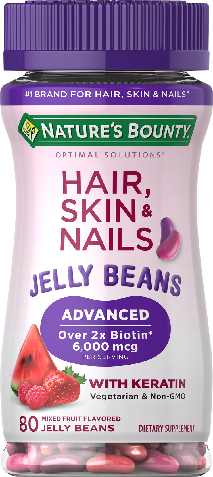 Nature's Bounty Optimal Solutions Advanced Hair, Skin & Nails Jelly Beans are delicious dietary supplements that include essential vitamins to support beauty from the inside.* Made with a non-GMO formula, these skin care supplements have no artificial flavor or sweetener, and are free of lactose and soy. Each serving includes 6,000 mcg of Biotin to support hair, skin & nails along with added Keratin and Vitamins A, C and E.* Adults can chew two watermelon, mixed berry, & strawberry flavored jelly beans a day, preferably with a meal. At Nature’s Bounty, we believe health and beauty go hand in hand. With nearly 50 years of making quality vitamins and more than 20 years in the beauty business, you can trust that every Nature’s Bounty product is backed by science, and made with the purest ingredients, guaranteed.