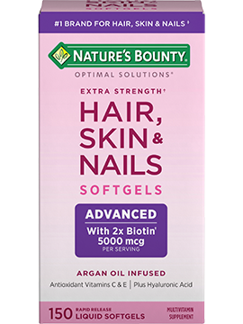 Nature’s Bounty® Optimal Solutions® Hair, Skin & Nails formula contains balanced nutrients to help you continue to look and feel your best.* Ingredients include Biotin, which helps to support beautiful hair, vibrant skin and healthy nails, plus Hyaluronic Acid and Vitamins A, C and E.* Contains 150 rapid release liquid softgels.