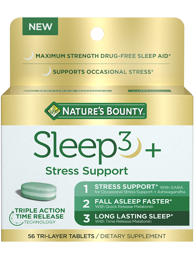 Wake up feeling refreshed with Nature’s Bounty® Sleep3+ Stress Support!* The First Maximum Strength Tri Layer Sleep+ Stress aid is a triple action supplement that provides support for occasional stress and promotes sound sleep.* Using innovative time-release technology, each layer is dissolved at different times throughout the night to help you relax, de-stress, and get long-lasting sleep.* Melatonin, a key ingredient in this innovative formula, plays a vital role in the maintenance of circadian rhythm “sleep-wake-cycle”, sleep induction, and sleep duration plus its perfect for those experiencing occasional sleeplessness.* Sleep3+ Stress Support contains 10 mg of melatonin per serving including both quick release melatonin to help you fall asleep fast, and time-release melatonin that works with your body’s natural sleep cycle to help you stay asleep longer while supporting quality restful sleep.* For added stress-relief benefits, Nature’s Bounty® Sleep3+ Stress Support also includes 100 mg of GABA to help relax the mind and support occasional stress, plus 60g of Ashwagandha per serving.*