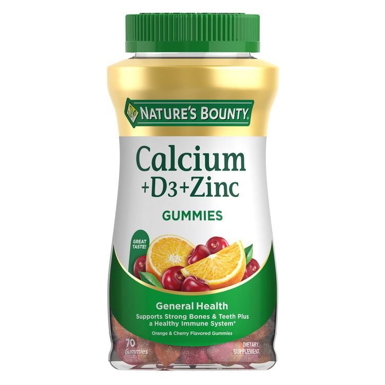 Nature’s Bounty® Calcium + Vitamin D3 + Zinc Gummies are a delicious and easy way to get the essential nutrients your body needs for strong bones and a healthy immune system.* Each serving contains 500 mg of Calcium and 25 mcg of Vitamin D3, key nutrients that support bone density, enhance calcium absorption, and contribute to overall wellness.* The addition of Zinc helps support your immune function, making these gummies a perfect choice for your daily health routine.*
