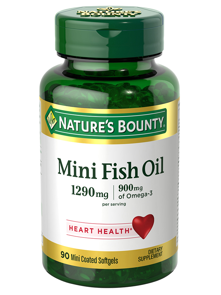 The best part about our Mini Fish Oil Softgels is that they’re small – in fact, they’re 35% smaller than other fish oil supplements, which means they’re much easier to swallow. Nature's Bounty® Premium Coated Mini Fish Oil provides Omega-3 EPA and DHA fatty acids for the body.* Omega-3 fatty acids support heart and cardiovascular health.* This mini softgel is coated, which means the active ingredients bypass the stomach and are digested in the small intestine, which can minimize the aftertaste and fish burps!